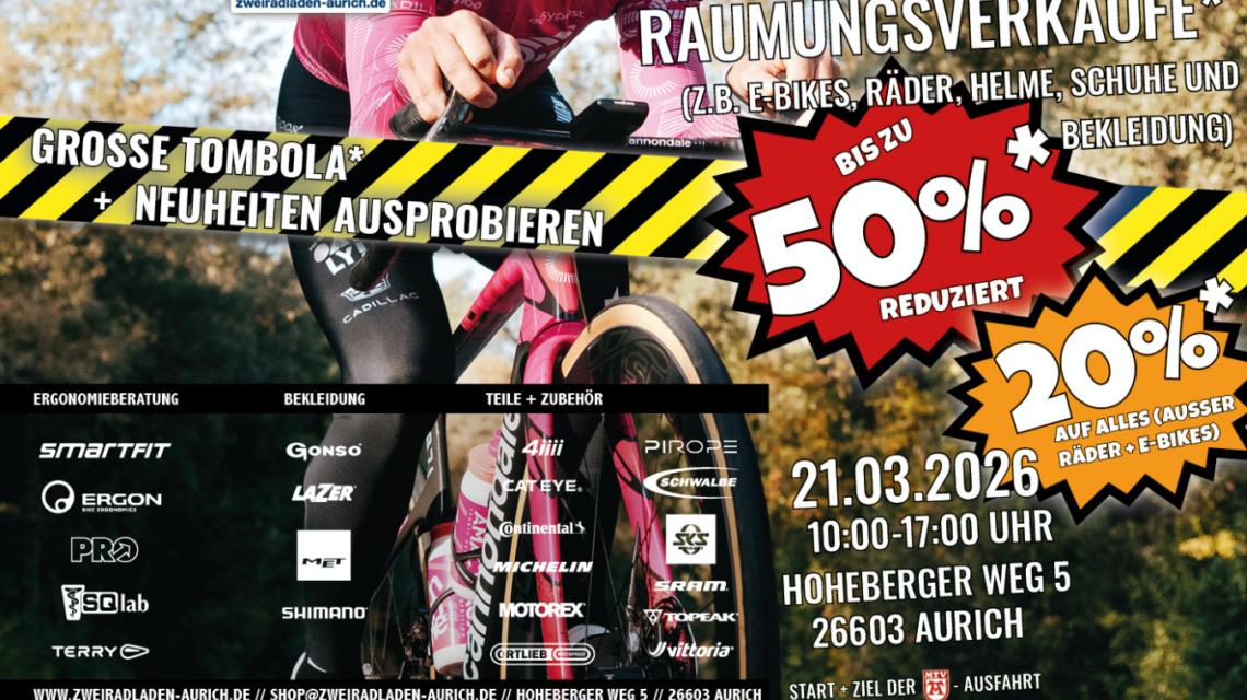 21.03.2026 | 10:00 – 17:00 Uhr Der Früh­ling ste­ht vor der Tür – und wir feiern den Start in die neue Sai­son mit euch!Am Sam­stag, den 21. März 2026, laden wir euch her­zlich zu unser­er großen Saison­star­tak­tion 2026 ein. Freut euch auf exk­lu­sive Ange­bote, span­nende Neuheit­en, per­sön­liche Beratung und ein tolles Rah­men­pro­gramm für die ganze Fam­i­lie. Ob ambi­tion­ierte Radsportler:innen oder Alltagsradler:innen – bei uns ist jede und jed­er willkom­men! Ein Tag voller High­lights 20% auf (fast) alles* Am 21.03.2026…