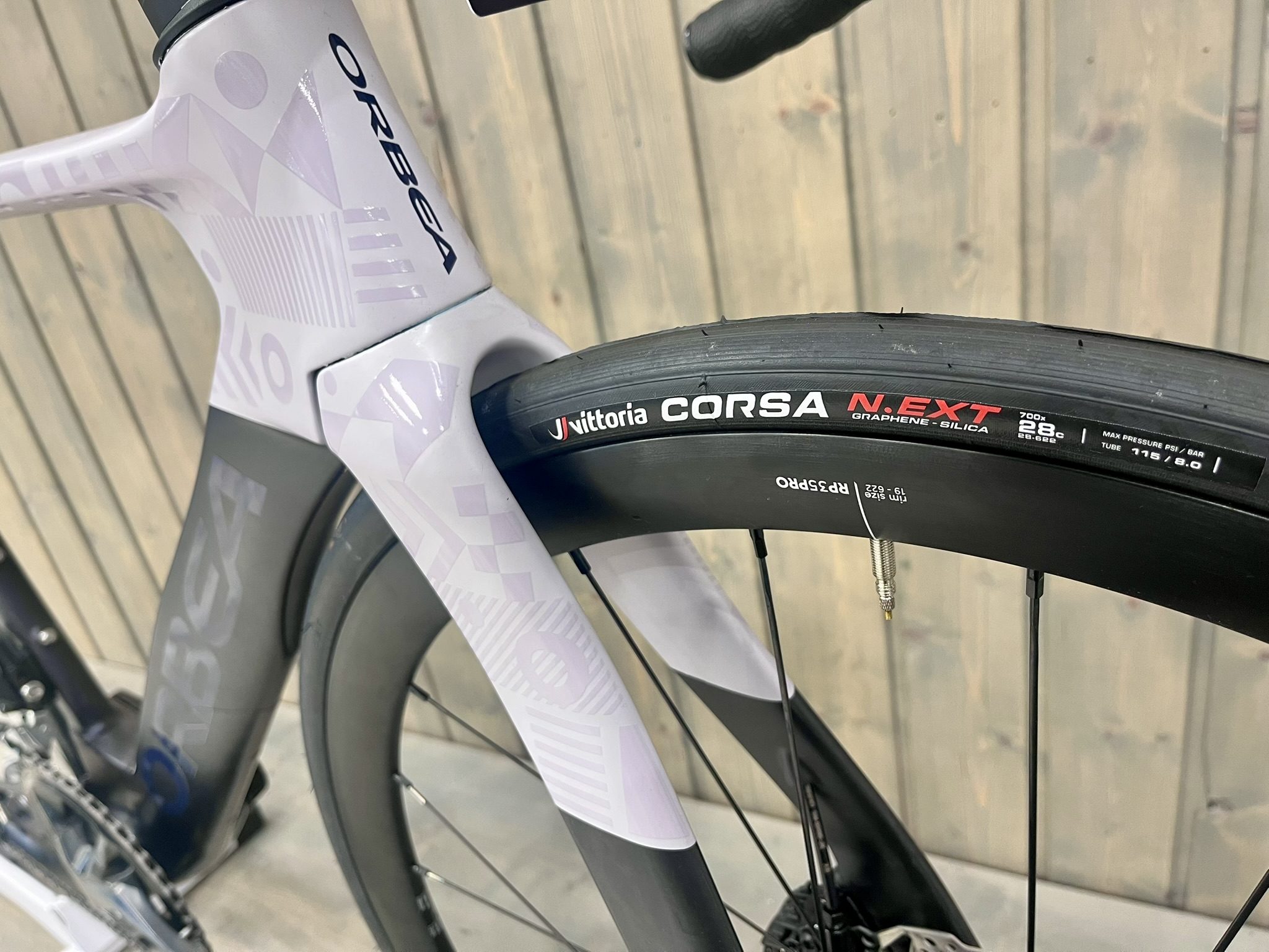 Orbea Orca Aero Car­bon OMX disc, mono­coque con­struc­tion, HS 1,5″, BB 386, pow­er­me­ter com­pat­i­ble, Thru Axle 12mm x 142mm rear, thread M12x2 P1, Speed release com­pat­i­ble, inter­nal cable rout­ing, EC/DC compatible.